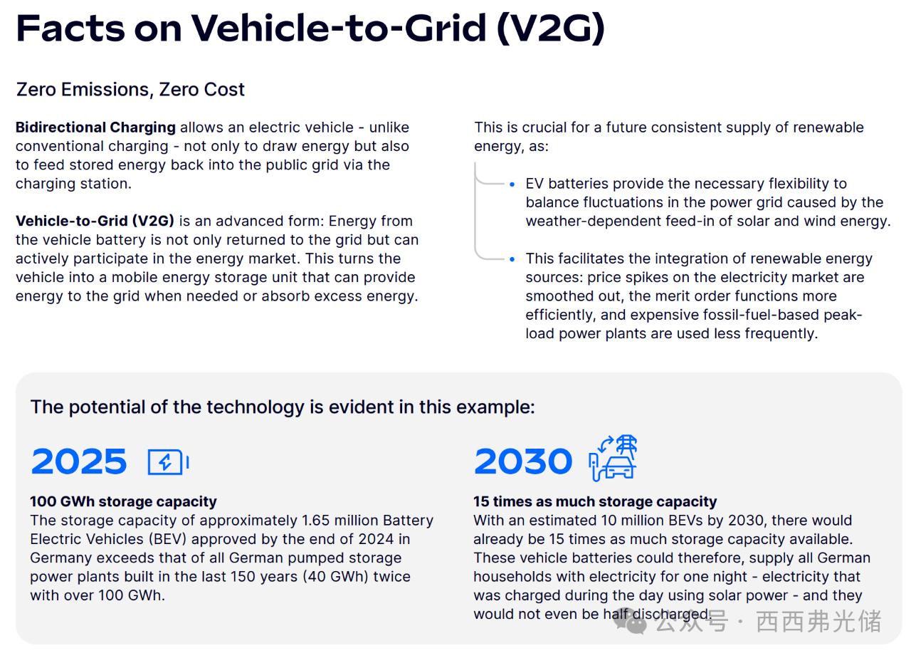 - 据预测,到2030年,德国的电动汽车保有量将达到1000万辆,届时其储能容量将是2025年的15倍。这些车辆电池储存的电量,足以在夜间为所有德国家庭供电——而这些电能完全可以由白天的太阳能充满,并且电池消耗甚至不到一半。