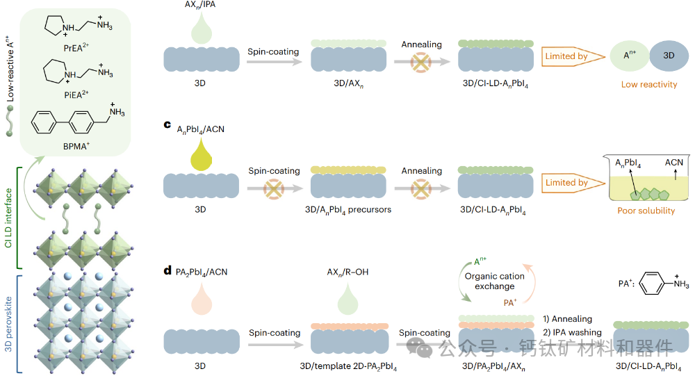 然而,新方法采用了一种开创性的方法来合成化学惰性界面,这些界面集成了具有低反应性的大块头有机阳离子,从而在不影响其光电特性的情况下保留了钙钛矿的精致结构。事实证明,这并非易事:所需的大块头阳离子通常难溶于与底层钙钛矿层相容的溶剂中,并且它们的低化学反应性固有地阻碍了界面形成所需的直接结晶过程。尽管 CI LD 界面具有理论吸引力,但这些挑战限制了 CI LD 界面的实际采用。