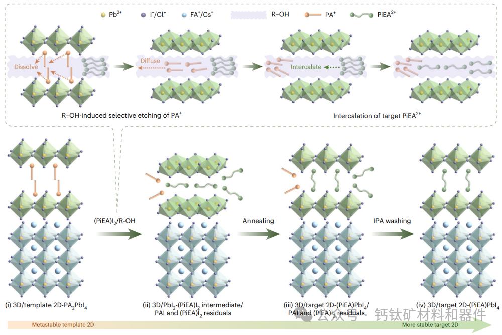 为了规避这些障碍,研究人员设计了一种新颖的选择性模板增长策略。该技术利用以传统阳离子作为结构模板形成的预先存在的亚稳态低维(LD)界面。通过促进有机阳离子交换过程,更稳定的化学惰性大块头阳离子逐渐取代了原始的反应物质,有效地将界面转变为坚固、持久且电学有利的区域。这种模板化转换保持了高效电荷传输所需的精确分层和结晶度,同时大大提高了界面稳定性。