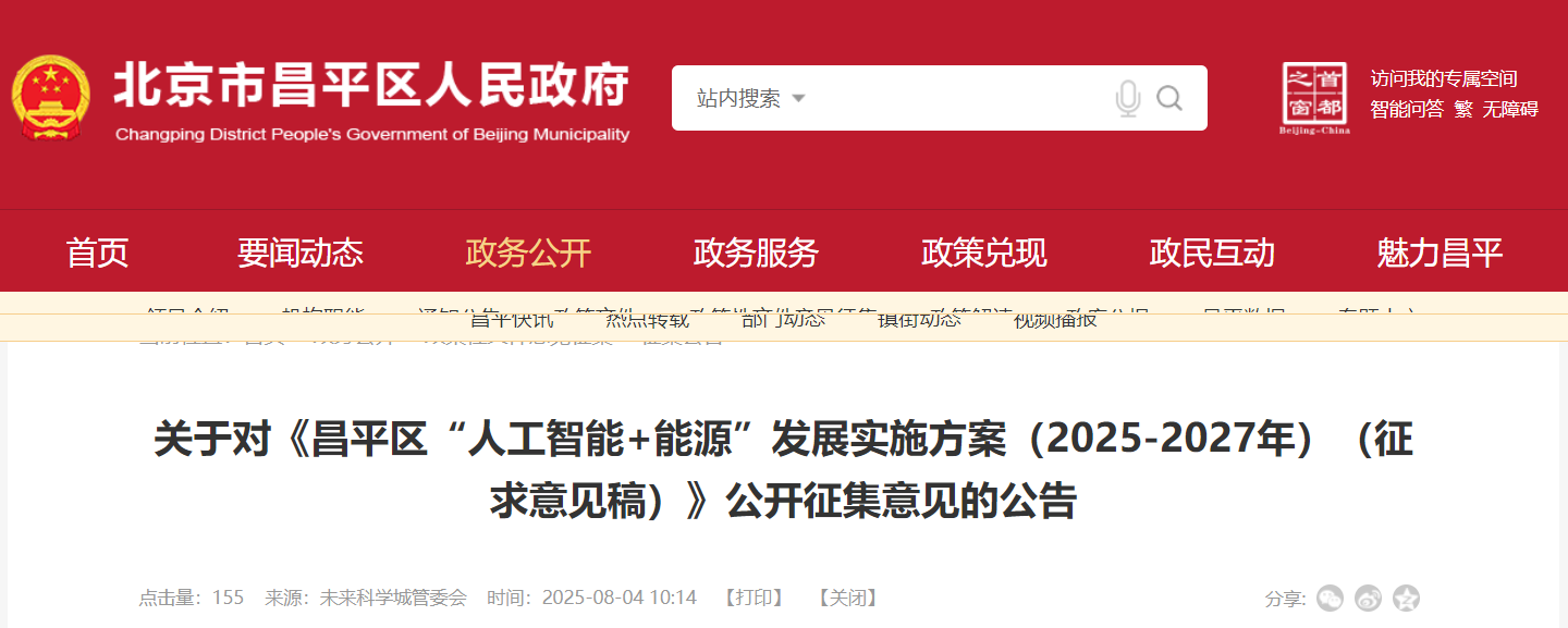 近日,北京市昌平区人民政府发布关于对《昌平区“人工智能+能源”发展实施方案(2025-2027年)(征求意见稿)》公开征集意见的公告。