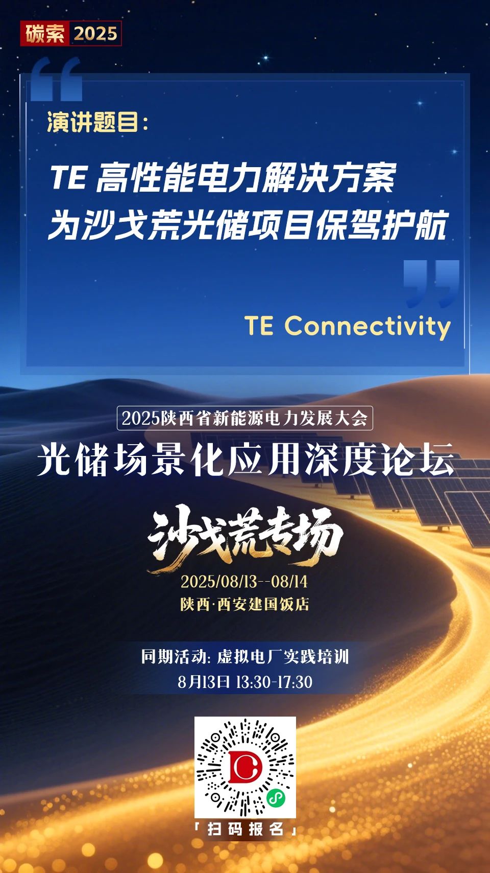 2025年8月13 - 14日,“逐光破界” 陕西省新能源电力发展大会暨光储场景化应用深度论坛 —— 沙戈荒专场将在西安盛大举行。届时,全球连接与传感领域的领军企业TE Connectivity将重磅出席,并带来《TE高性能电力解决方案为沙戈荒光储项目保驾护航》的主题演讲,为沙戈荒光储项目的发展提供前沿思路与创新方案。