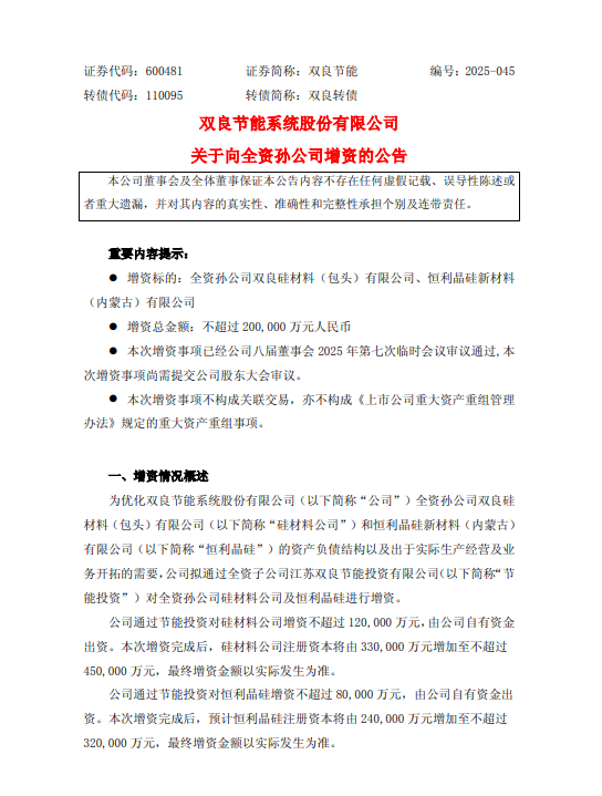 8月5日,双良节能(600481)发布公告,宣布将通过全资子公司江苏双良节能投资有限公司(以下简称“节能投资”),对全资孙公司双良硅材料(包头)有限公司(简称“硅材料公司”)和恒利晶硅新材料(内蒙古)有限公司(简称“恒利晶硅”)进行增资,总金额不超过20亿元。