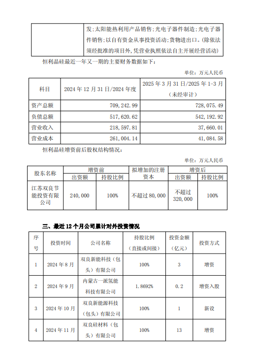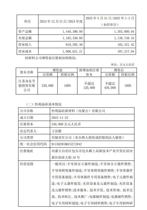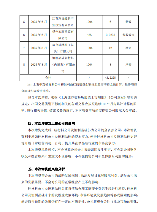 根据公告内容,双良节能此次增资计划明确且力度颇大。针对硅材料公司,公司拟通过节能投资增资不超过120,000万元,资金全部来源于公司自有资金。增资完成后,硅材料公司注册资本将从330,000万元增加至不超过450,000万元,具体增资金额以实际发生情况为准。而对于恒利晶硅,增资规模同样可观,公司通过节能投资增资不超过80,000万元,同样使用自有资金。增资后,恒利晶硅注册资本预计由240,000万元增加至不超过320,000万元,最终金额依实际而定。