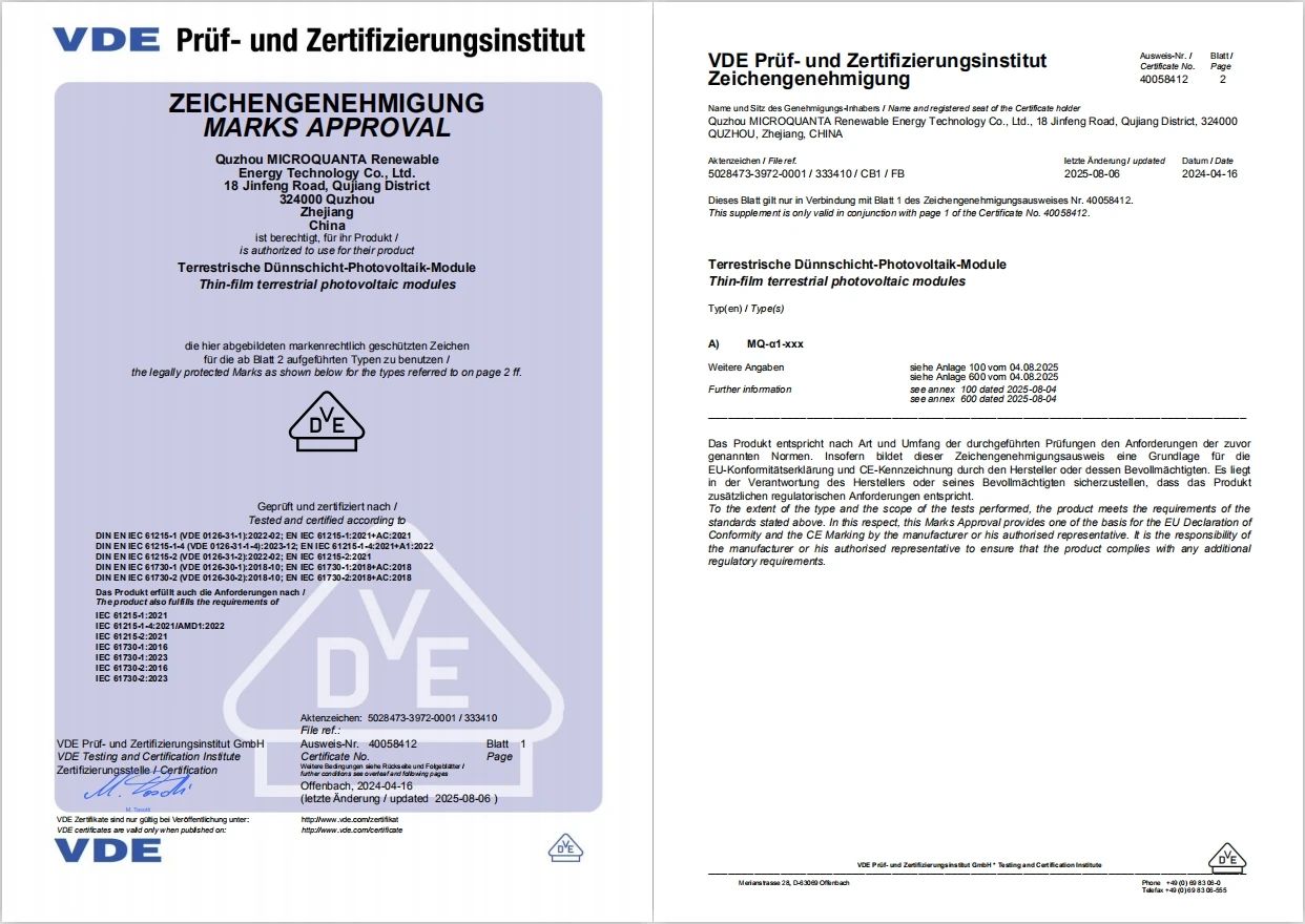 近日,纤纳光电α²钙钛矿组件通过IEC61215、IEC61730稳定性认证,功率达125W,获得德国电气工程师协会(VDE)颁发的认证证书。在钙钛矿光伏领域,稳定性是决定组件能否大规模商业化应用的核心要素,也是纤纳光电自成立以来始终努力提升的方向。