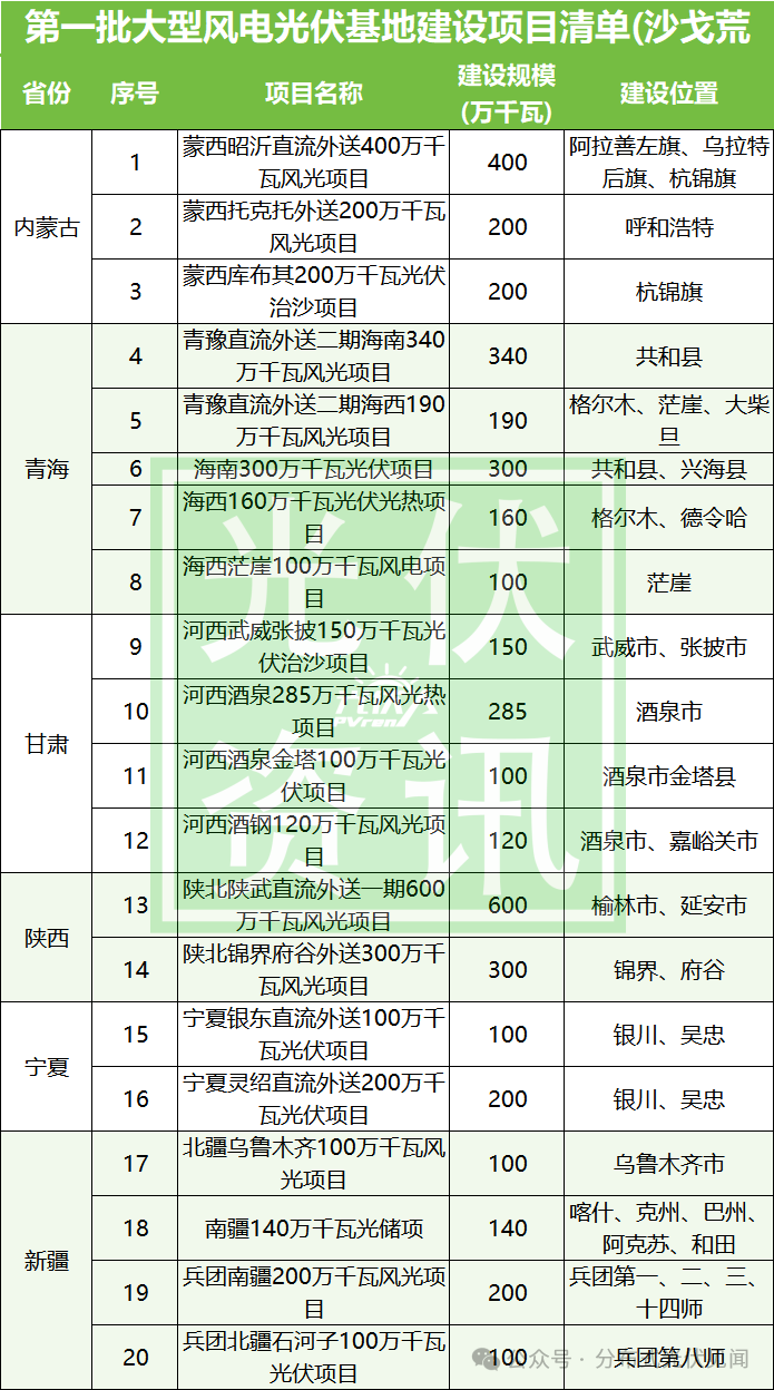 腾格里新能源基地:基地项目总体建设规模为1200万千瓦,其中,风电400万千瓦,光伏发电800万千瓦,配套4×100万千瓦煤电作为支撑性电源。