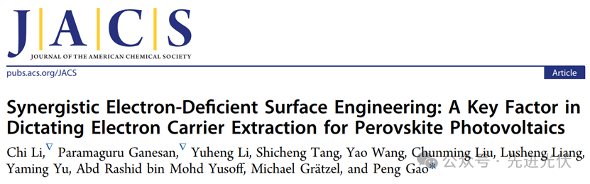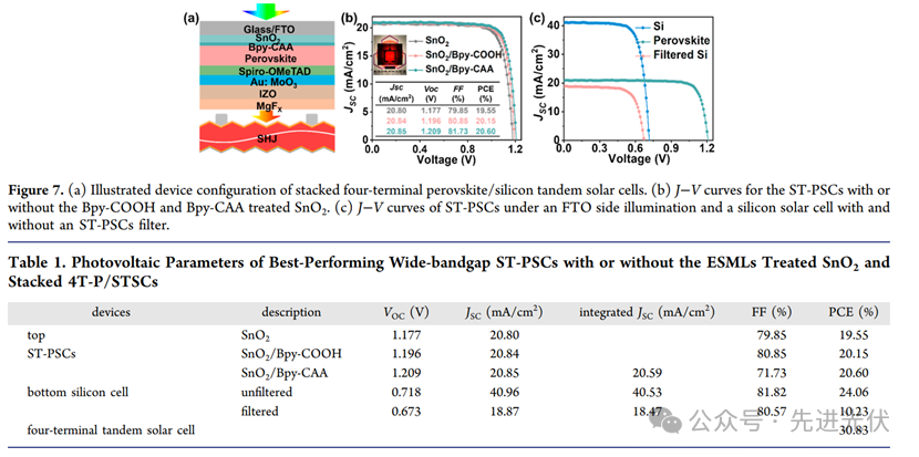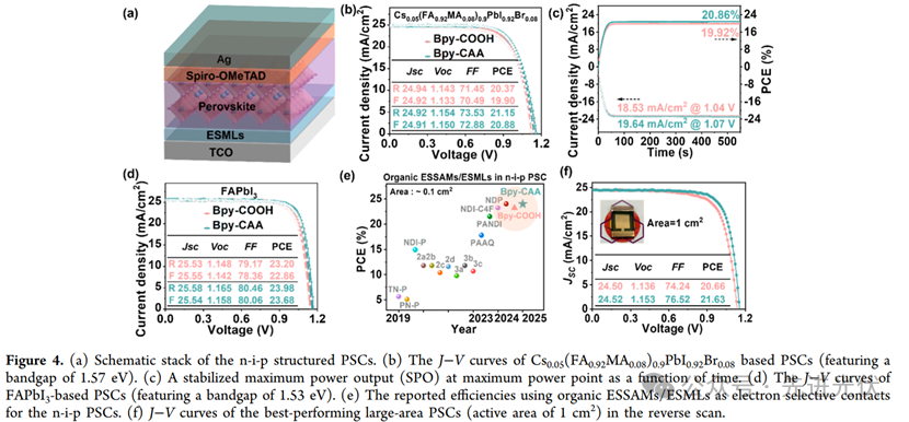 本文通过协同电子缺陷表面工程调控电子选择性分子层(ESMLs)在钙钛矿太阳能电池(PSCs)中的应用。研究团队系统分析了不同电子缺陷强度的材料,发现表面修饰对界面偶极取向具有主导作用。通过将羧酸基团(Bpy-COOH)替换为氰基丙烯酸基团(Bpy-CAA)的双功能联吡啶基电子选择性分子层,增强了在n-i-p PSCs中的吸附、电子提取和钝化效果。Bpy-CAA器件实现了23.98%的效率,并在1 cm²电池中保持了21.63%的效率,这是使用有机ESMLs的n-i-p PSCs中报道的最高值。将该架构应用于四端钙钛矿/硅串联太阳能电池(4T-P/STSCs)获得了30.83%的效率。研究表明分子的电子性质比偶极取向对电子提取效率更具决定性作用。