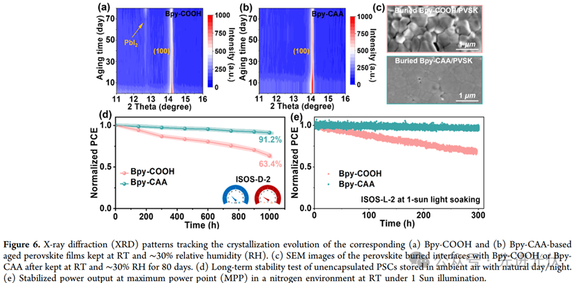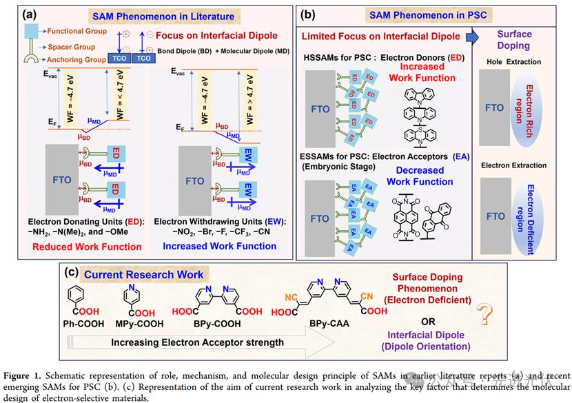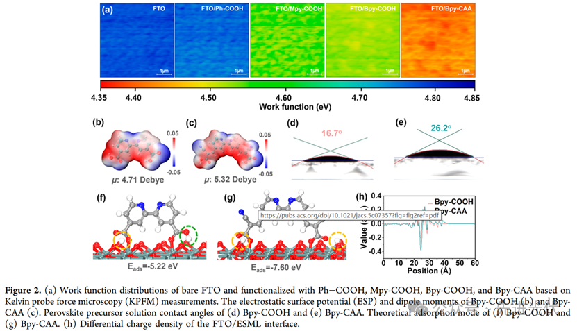 Figure 1图中特别强调了电子缺陷表面修饰相对于偶极取向的主导作用,为后续Bpy-COOH和Bpy-CAA的设计提供了理论基础。
