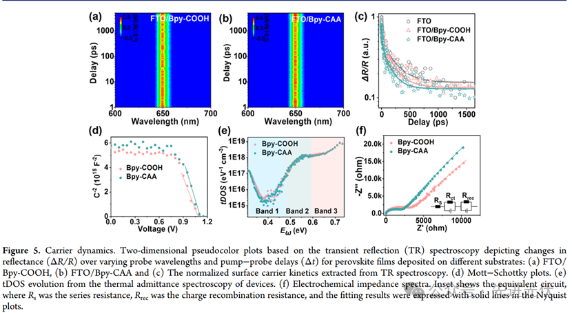 Figure 5展示了载流子动力学。(a-c)瞬态反射(TR)光谱的二维伪彩图显示不同基底上钙钛矿薄膜的反射率变化(ΔR/R)与泵浦-探针延迟(Δt)的关系。(c)从TR光谱提取的归一化表面载流子动力学表明Bpy-CAA具有更短的载流子寿命(138.69 ps),证明其更有效的电子提取。(d)莫特-肖特基图显示Bpy-CAA器件具有更高的内置电势(1.088 V)。(e)热导纳光谱获得的陷阱态密度(tDOS)演化显示Bpy-CAA在0.4 eV附近具有更低的浅能级陷阱密度。(f)电化学阻抗谱证实Bpy-CAA基器件具有更高的电荷复合电阻(546 KΩ/cm² vs 324 KΩ/cm²)。