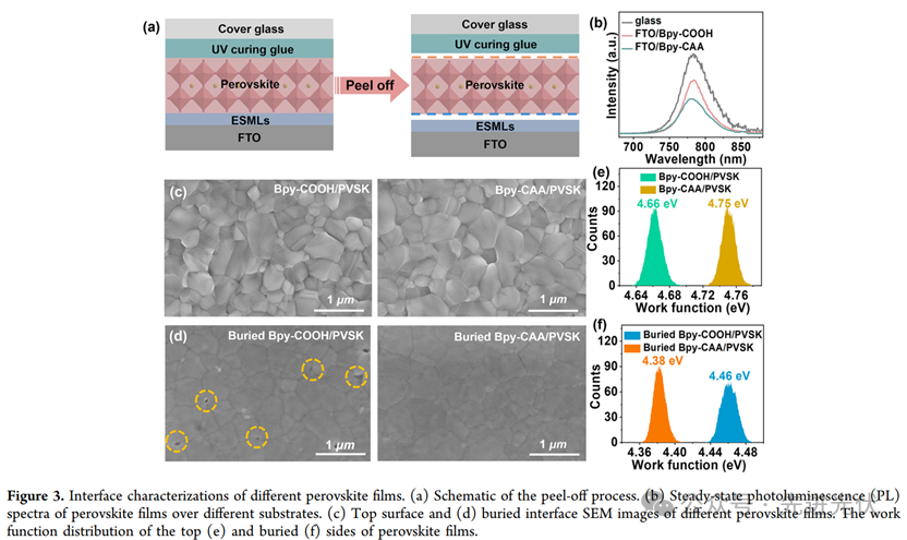 Figure 3展示了不同钙钛矿薄膜的界面特性。(a)剥离过程示意图显示实验方法。(b)稳态光致发光(PL)光谱表明Bpy-CAA基样品具有最弱的PL峰强度,证明其更有效的电子提取能力。(c)顶部表面和(d)埋入界面SEM图像显示Bpy-CAA薄膜具有更好的均匀性和更大的晶域。(e)顶部和(f)埋入界面钙钛矿薄膜的功函数分布显示Bpy-CAA引起更明显的n型埋入界面和向下能带弯曲,有利于电子提取和空穴排斥。