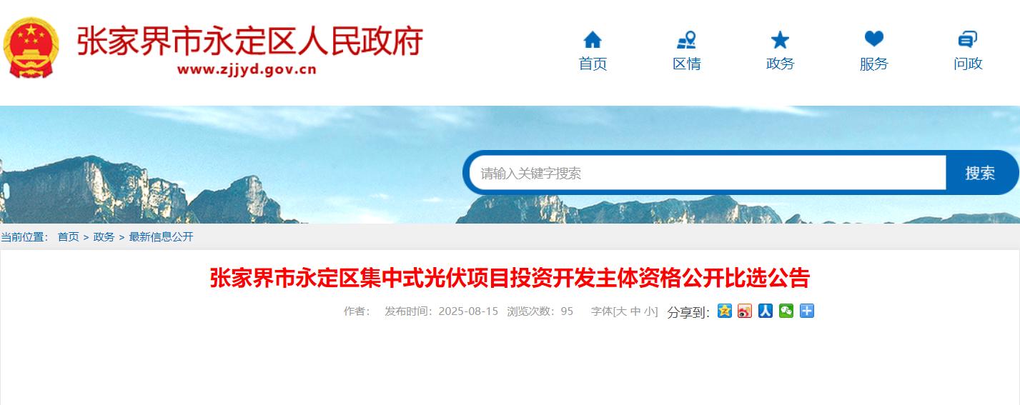8月15日,湖南省张家界市永定区集中式光伏项目投资开发主体资格公开比选公告发布。