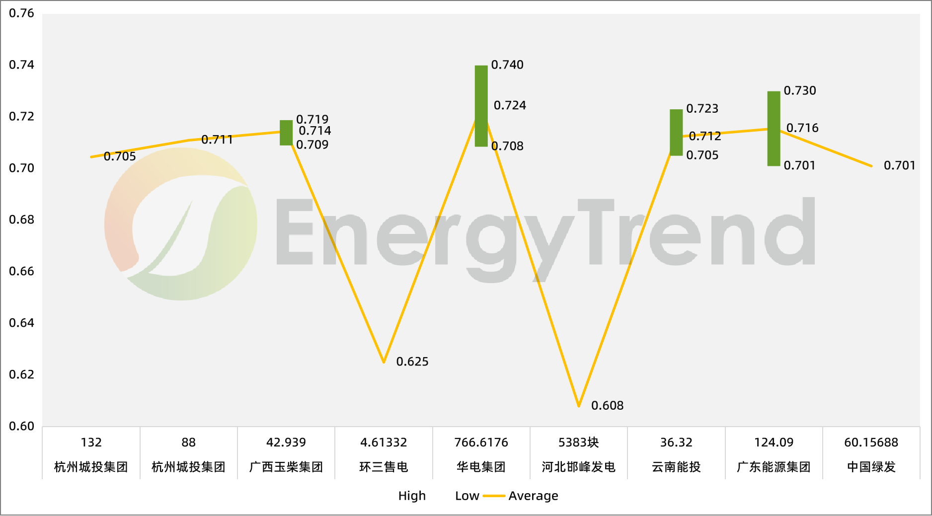 最低报价由河北昊攀环保科技有限公司在华能邢台综能、新河邯昊、河北洁源、清河旭昇光伏场站光伏组件采购中投出;最高报价由正泰新能在四川华电凉山州盐源白乌二期等640MW光伏发电项目光伏组件采购中投出。