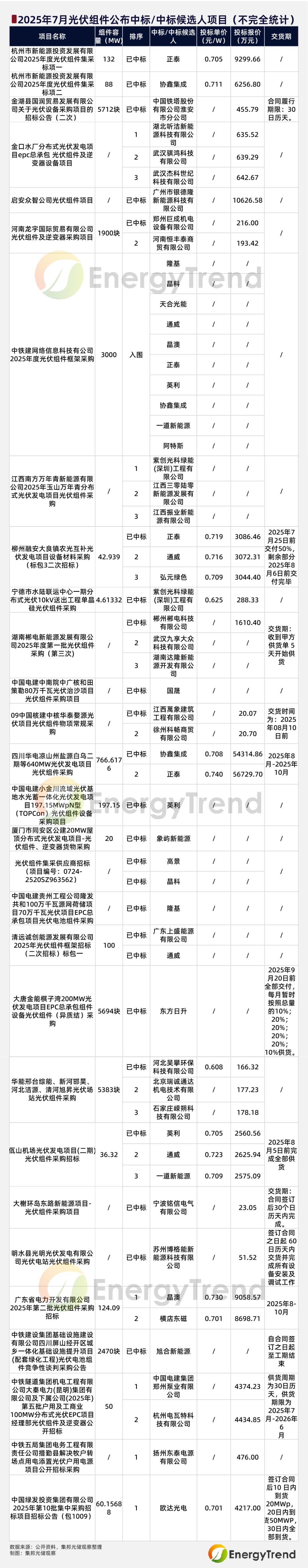 据集邦光储观察不完全统计,2025年7月光伏组件已公布中标结果及中标候选人的规模达4.62GW,含已定标规模1.39GW,第一中标候选人规模3.23GW。