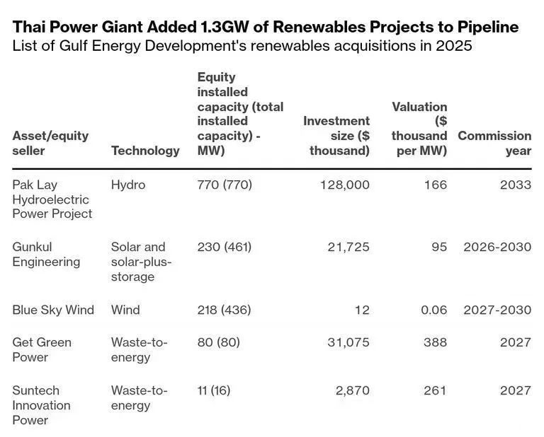 作为泰国最大的独立电力开发商,Gulf近年来加速向清洁能源转型。据公司披露,其通过1.84亿美元股权投资,收购了1.3GW在建及已获许可的清洁能源项目,涵盖太阳能、风能及垃圾发电领域。这一举措使其清洁能源版图迅速扩张,目前运营中的可再生能源装机容量已突破1GW,包括地面太阳能、陆上风电及垃圾发电项目。