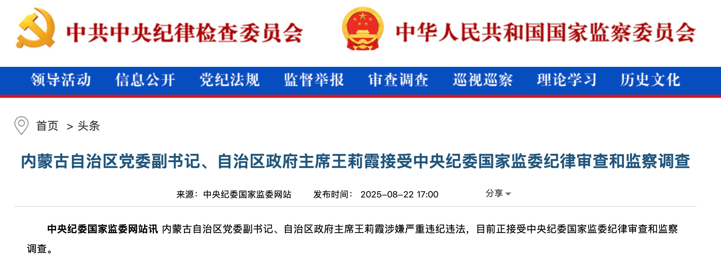 8月22日,索比光伏网从中央纪委国家监委网站了解到,内蒙古自治区党委副书记、自治区政府主席王莉霞涉嫌严重违纪违法,目前正接受中央纪委国家监委纪律审查和监察调查。