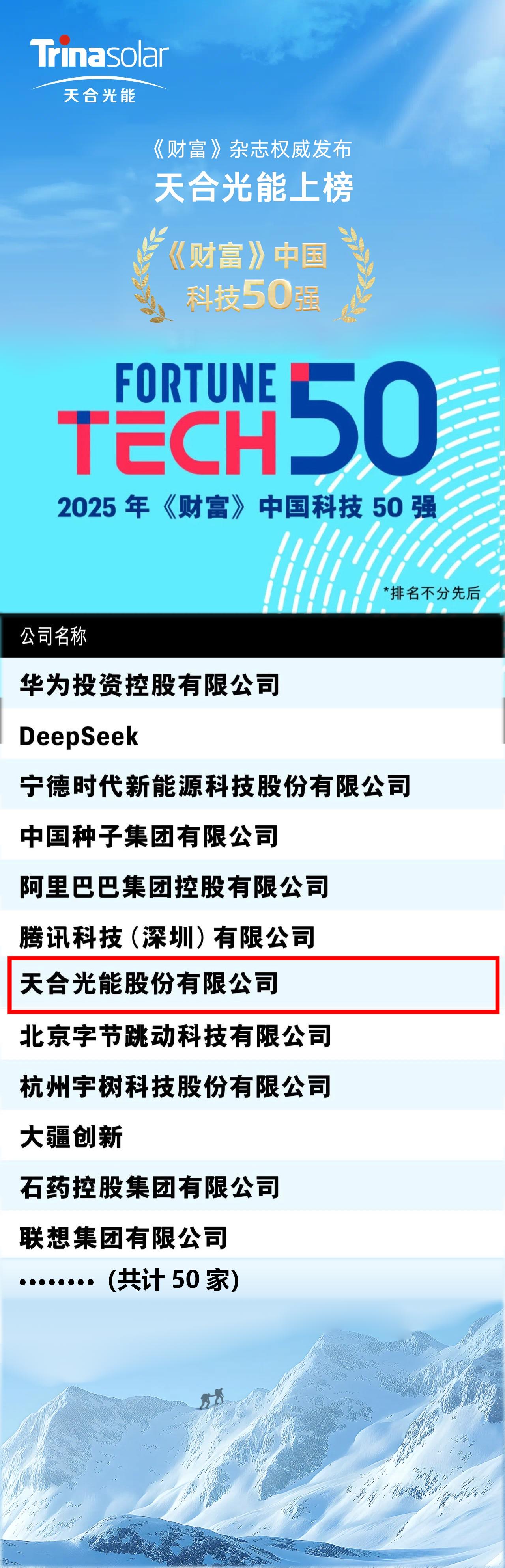近日,2025年《财富》中国科技50强榜单正式发布,天合光能凭借其在光储技术与智慧能源解决方案方面的卓越创新荣登榜单,同期荣列的还有Deepseek、阿里巴巴、腾讯、字节跳动、宇树科技、宁德时代、大疆等企业。