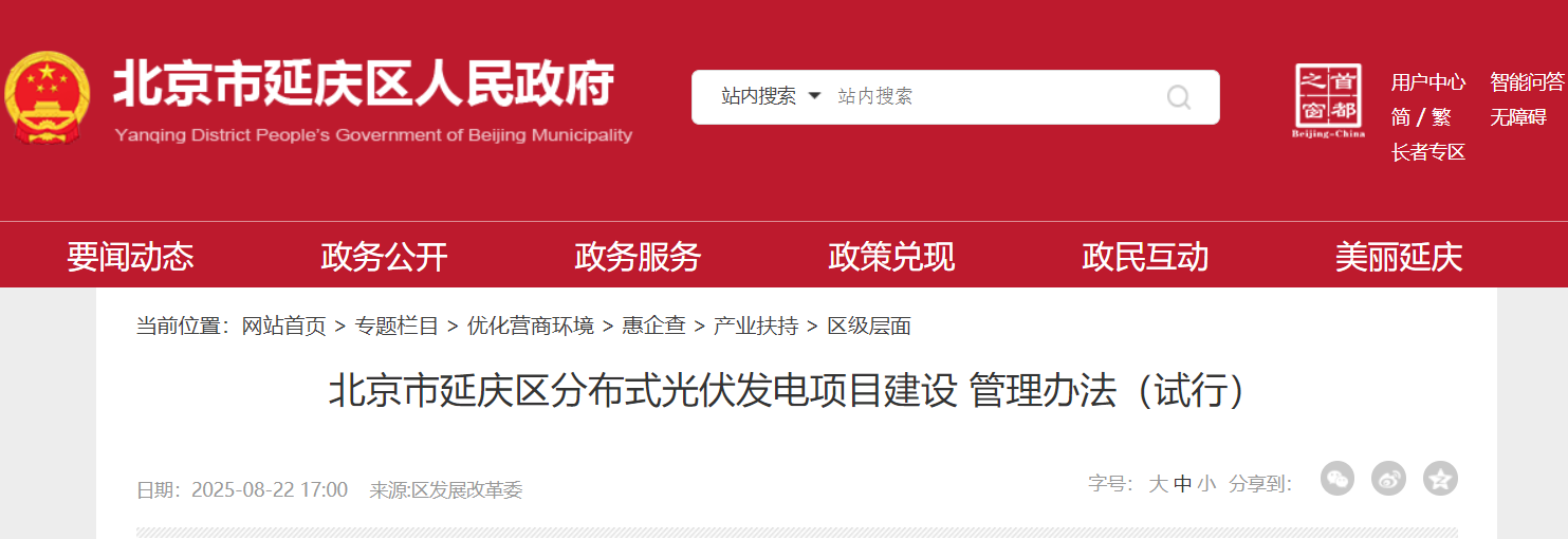 8月22日,北京市延庆区发改委发布分布式光伏发电项目建设管理办法(试行)其中指出,分布式光伏发电项目利用既有建筑建设,应充分考虑建筑承载能力、安全性和合理性。有下列情形之一,禁止安装光伏组件:建筑屋顶屋面年久失修的;建筑主体结构存在安全隐患的;建筑为违法建设的或未经分类处置处罚完毕的两违建筑;荒废、空闲和空白宅基地(无地上物)的;农村住宅屋顶和平台搭建采光房、钢棚的;已列入搬迁、拆迁腾退计划,或未来3年内可能因村庄规划发生变动的;存在其他不应安装光伏组件情形的。