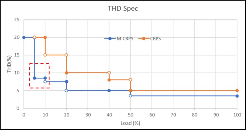 随着服务器计算需求的增长,特别是云计算和人工智能(AI)计算的兴起,服务器CPU/GPU所需功率大幅增加,服务器电源的功率已经从21世纪初的200W至300W范围增加到3000W/5500W甚至8000W以上。为了满足电子产品对高质量电源的需求,同时,在行业头部企业和节能减排宏观趋势的驱动下,服务器电源的行业标准也将从当前国内普遍采用的CRPS2.2标准逐渐升级到M-CRPS标准,新标准对掉电再恢复的冲击电流、电网电流THD、PF值及功率密度等方面提出了更为严格的要求,THD新旧标准差异如图1所示。
