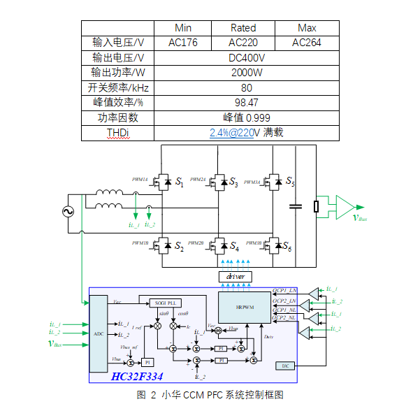 小华半导体基于HC32F334芯片的两路交错无桥图腾柱CCM PFC参考设计方案系统控制框图如图 2所示,方案采用平均电流控制,利用高速霍尔传感器采集电感电流平均值,同时实现交错控制。图3为满载电流波形。图4为满载电感电流交错以及均流波形。图5为参考方案的THD、PF值以及效率曲线。参考方案的THD与PF值指标满足最新更加严格的M-CRPS标准,如图12、图13所示。其主要规格参数如下表所示: