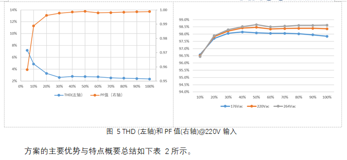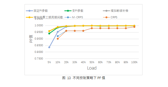 如图12所示,图中分别画出了采用固定PI参数下的电流THDi以及采用变PI参数下的电流THDi。采用固定PI变参数时,将Kf取值固定为0.3,这样设计可保证轻载至满载范围内电流环路稳定。由图可知,如果采用固定的PI参数设计,5%至10%负载区间THDi不满足M-CRPS标准要求,同时50%负载以上接近M-CRPS标准要求上限。