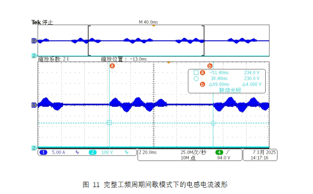 通常,满足轻载电流THD的要求要比满足重载电流THD要求更困难;特别是在满足M-CRPS标准中5%负载THD不大于8.5%以及负载低于5%不大于20%要求时,尤其如此。因此,本参考方案为了应对上述难点,设计了完整工频周期间歇控制策略。当负载较轻时,控制进入间歇模式,开关时刻控制在工频过零点发生。这样就可以保证间歇模式下,开出来的波形为完整工频周期,即可保证轻载下的电流THD。如图11所示,为完整工频周期间歇模式下的电感电流波形。