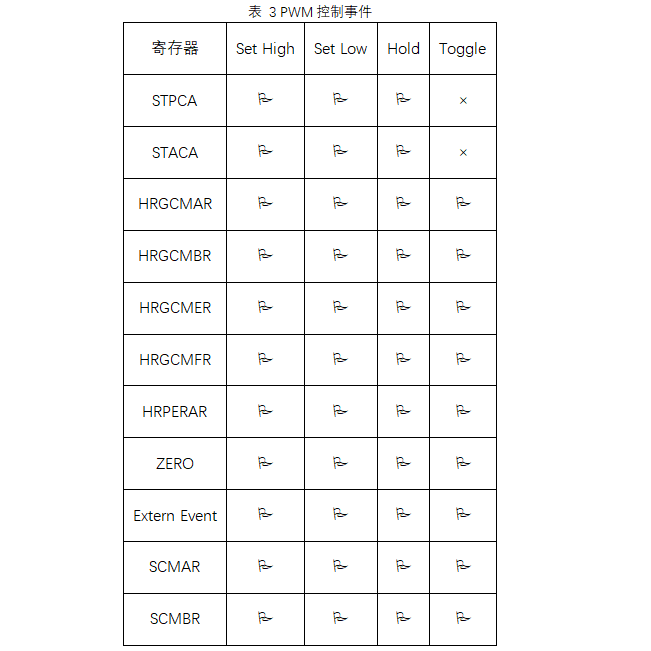 如所示,STPCA寄存器可配置计数停止端口状态;STACA寄存器可配置计数开始端口状态;HRGCMmR(m=A、B、E、F)四个比较寄存器具备高精度;HRPERAR为计数周期点,ZERO为计数零点,计数周期点以及计数零点可单独设定端口动作;10个外部事件源可选择相应GPIO口,也可分别选择3个内部比较器中的任意一个输出事件;SCMAR、SCMBR为两个低精度特殊比较寄存器,除了具备端口动作功能外可专门作为ADC的同步触发源事件以及HRPWM单元间或单元自身的计数器动作源(启动、清零、捕获)。