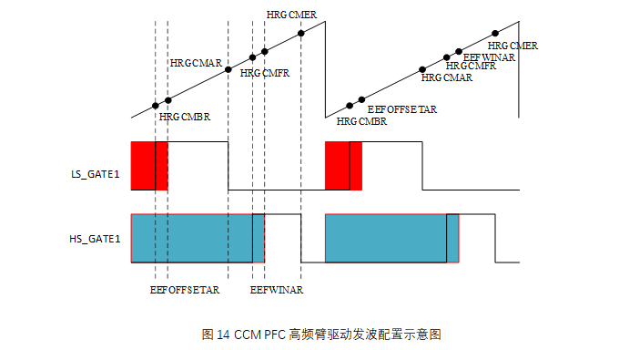 得益于HC32F334芯片HRPWM外设的上述优势,小华的两路交错无桥图腾柱CCM PFC拓扑参考方案可以轻松搞定驱动波形。其中,一路高频臂的驱动波形示意图如图14所示:由图14可以看出,高频臂上下管驱动分别通过HRPWM外设定时器的四个寄存器实现,优势是上下管驱动脉宽可以实现从0占空比到百分百占空比(反之亦然)的连续调整。另外,通过配置HRPWM外设以及EEFOFFSETAR、EEFWINAR两个寄存器的值可分别实现对高频臂上下管的单周期的OCP保护事件的消隐功能,屏蔽驱动边沿单周期保护的误动作。