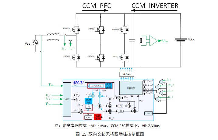 随着光储新能源、新能源汽车V2G车载电源、便携式储能、阳台光伏等双向能量传输的需求,基于双向能量传输的拓扑越来越受到客户青睐。本参考方案的无桥图腾柱CCM PFC便是一种可实现AC/DC以及DC/AC的双向拓扑。小华HC32F334也能很好的支持基于CCM的无桥图腾柱逆变(并、离网)拓扑控制策略,系统框图如图15所示。欢迎大家开发探讨。