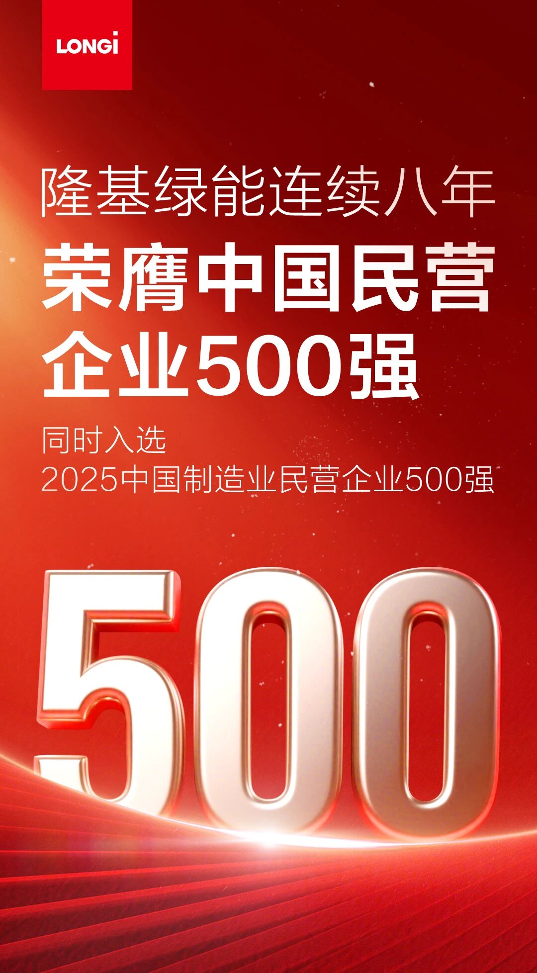 近日,全国工商联发布“2025中国民营企业500强”,隆基绿能位列第128位。在同期发布的“2025中国制造业民营企业500强”榜单中,隆基位列第91位。