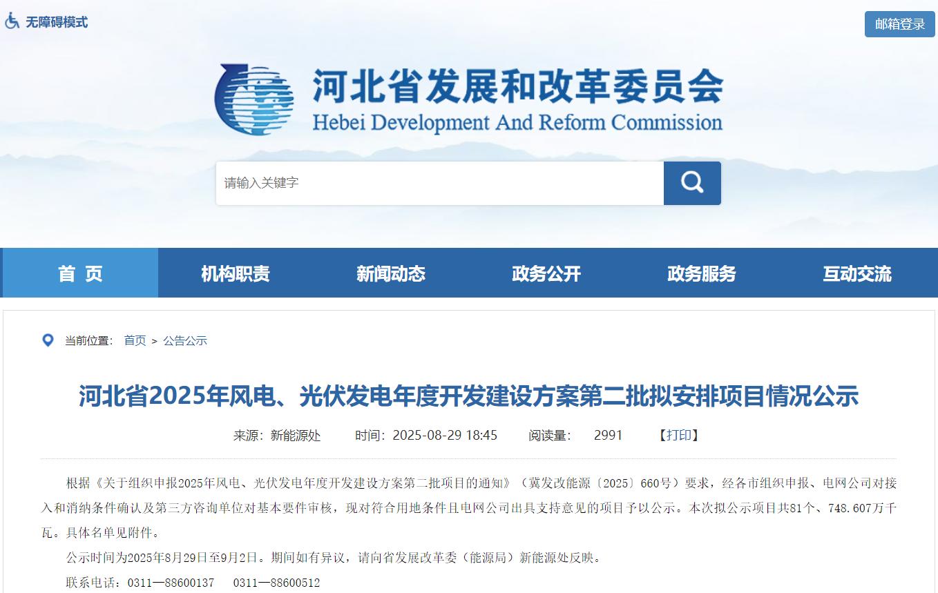 8月29日,河北省发改委公示《2025年风电、光伏发电年度开发建设方案第二批拟安排项目情况》,共81个新能源项目(含1个风光储项目),总规模为748.607万千瓦。从项目类型来看,风电项目:40个,规模合计435.7万千瓦;光伏项目:42个,规模合计312.907万千瓦。从项目投资集团来看,华电集团:获得规模最大,达到122.3万千瓦;大唐集团、国家能源集团、国家电投也都获得较大的规模。公示时间为2025年8月29日至9月2日。期间如有异议,请向省发展改革委(能源局)新能源处反映。