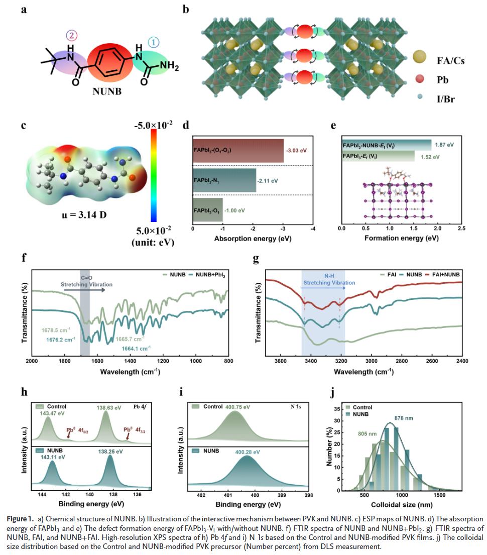 设计空间柔性多位点钝化剂NUNB:通过不对称结构和多个活性位点(C=O/N–H)实现与Pb²⁺的配位和与FA⁺/MA⁺的氢键作用,协同钝化缺陷并调控结晶过程。