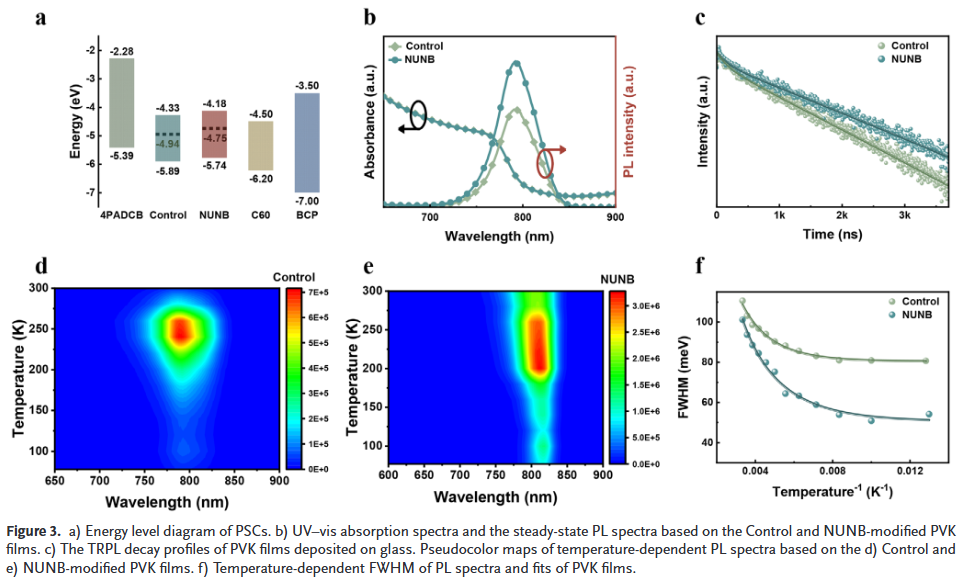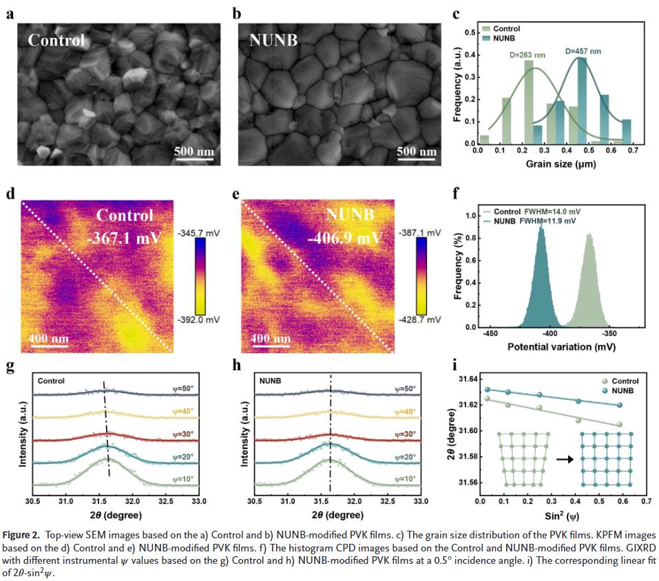 本研究大连理工大学梁红伟、中国科学院杨孟锦、谢莉莎和葛子义等人将一种空间柔性多位点酰胺衍生物 N-(叔丁基)-4-脲基苯甲酰胺(NUNB)引入钙钛矿中,不仅通过其空间柔性的 C=O/N–H 官能团与 PVK 相互作用钝化缺陷,还能通过与 FA⁺/MA⁺ 形成氢键调控结晶过程,从而获得具有更大晶粒、更低残余张力和缺陷密度的高质量 PVK 薄膜。同时,NUNB 能有效调控电荷传输行为,抑制陷阱辅助的非辐射复合,并提升钙钛矿太阳能电池(PSCs)的稳定性。
