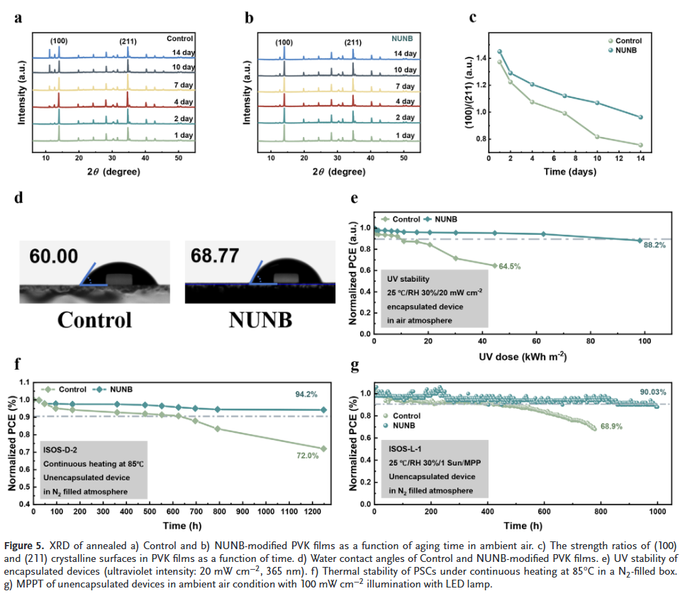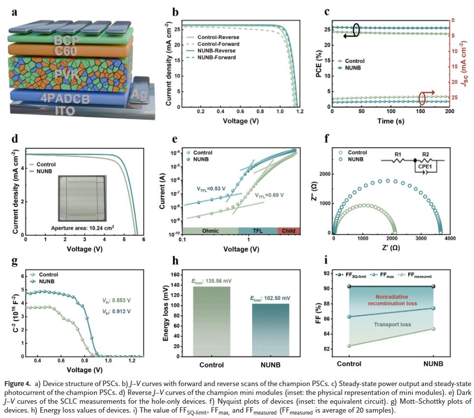 实现高效率与高稳定性:NUNB修饰的反式PSC效率达26.34%(认证26.03%),组件效率达21.92%,并在MPP跟踪1000小时后仍保持90%以上初始效率。