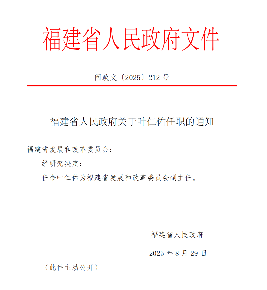 近日,福建省政府发布人事任免通知,任命叶仁佑为福建省发展和改革委员会副主任。