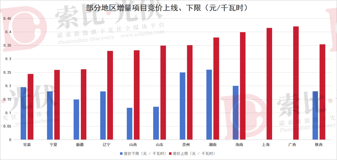 截至目前,新疆、山东、湖南等9个省份已公布首次竞价上下限标准:其中新疆、宁夏、山西、贵州4地的竞价上限已与当地燃煤发电基准价持平;针对光伏项目,竞价下限最低值为山东的0.123元/千瓦时,竞价上限最高值则为海南的0.3998元/千瓦时。