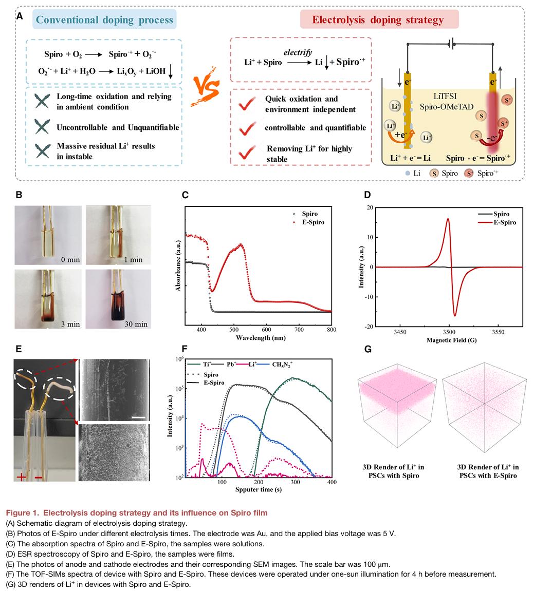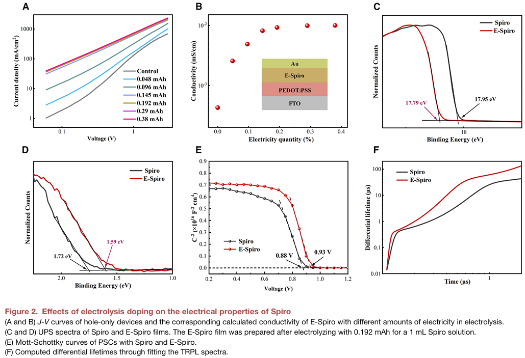 传统的有机空穴传输层(通常包含LiTFSI)在钙钛矿太阳能电池(PSCs)中需经历复杂耗时的氧化过程,并伴随大量残留Li⁺,影响器件稳定性。本文提出一种新型电解掺杂策略,通过调控电解过程实现可控掺杂并有效去除Li⁺。该策略利用空穴氧化有机半导体形成自由基,同时在阴极还原Li⁺为Li金属,从而实现精准掺杂与Li⁺去除。采用电解处理的Spiro作为空穴传输层的正式结构PSCs实现了26.16%的光电转换效率(PCE),采用电解PTAA的反式结构PSCs实现了25.57%的PCE,并表现出优异的稳定性。