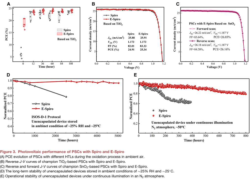 实现高效率与高稳定性并存:正式结构PSCs效率达26.16%,反式结构达25.57%,并在连续光照1400小时后仍保持91%初始效率。
