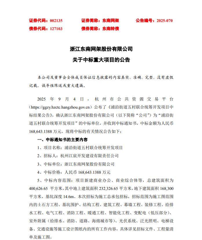 9月4日,东南网架发布关于中标重大项目的公告。