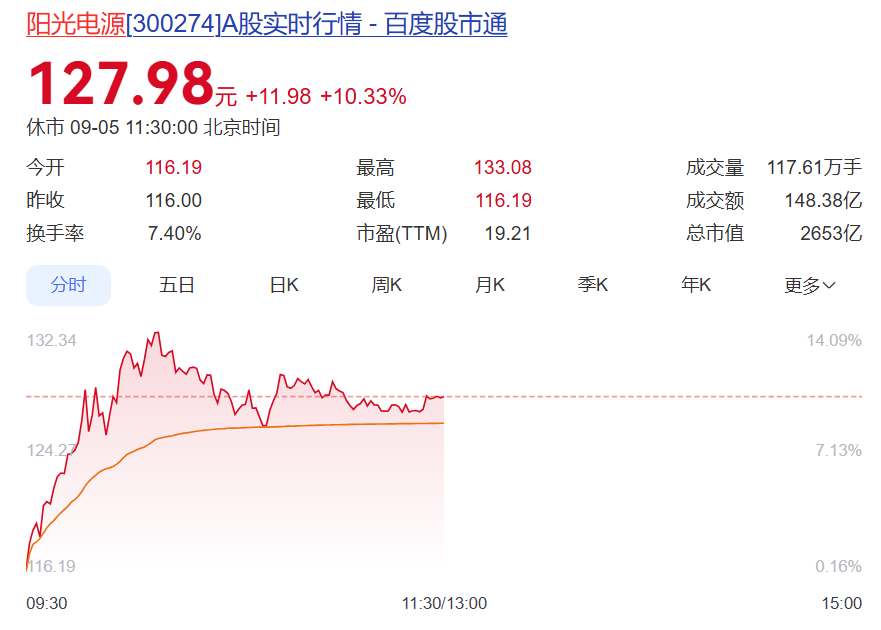 9月5日,阳光电源(SZ:300274)早盘盘中股价一度涨超14%,股价最高触及133.08元/股,强势突破了2021年7月30日125.25元/股的历史高点。截至午间收盘,公司总市值达到2653亿元,A股光伏市值第一股的地位愈发稳固。