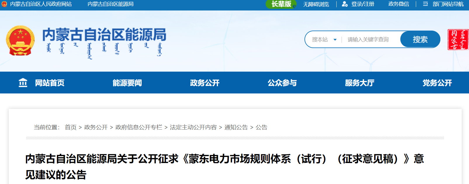 为贯彻落实全国统一电力市场建设要求,规范蒙东电力市场建设和运营,维护电力市场秩序和市场成员合法权益,加快推进蒙东电力现货市场建设,内蒙古自治区能源局会同国家能源局东北监管局组织有关单位研究编制了《蒙东电力市场规则体系(试行)(征求意见稿)》,包含“1+8”系列规则,即1个基本规则和8个实施细则。现向社会公开征求意见。欢迎有关单位和个人提出宝贵意见建议。