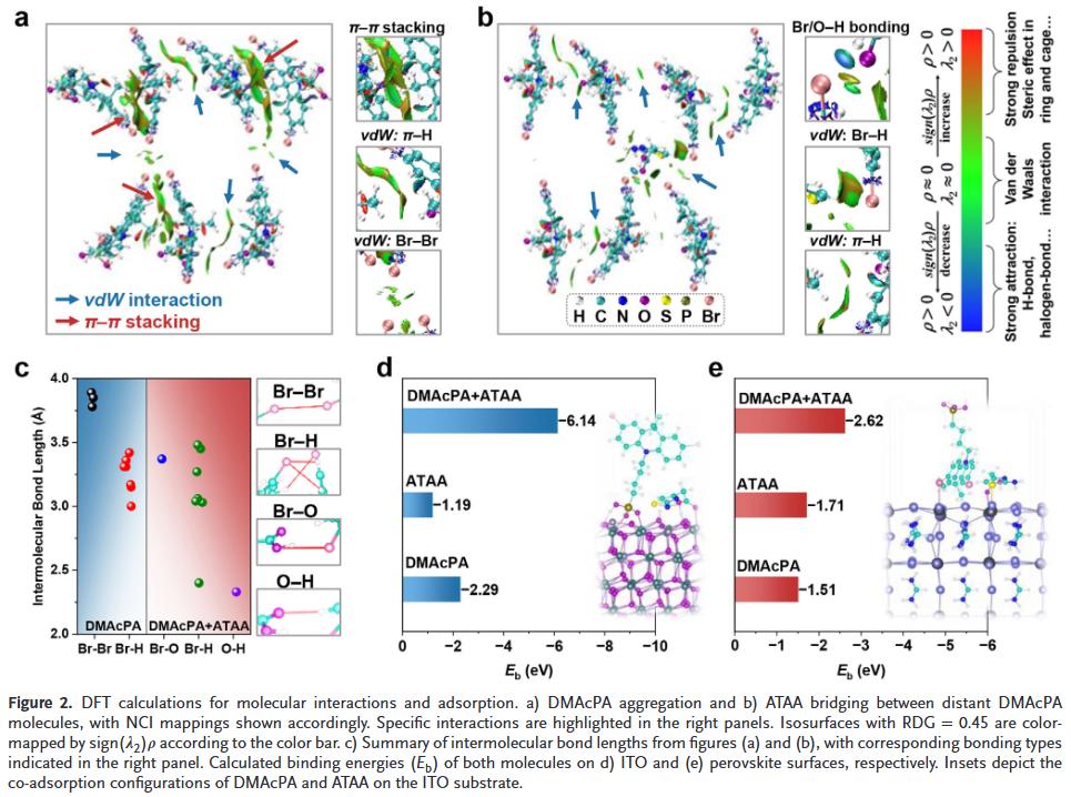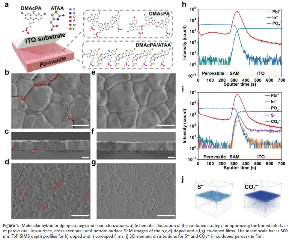 提出分子杂化桥接策略:通过引入新型小分子ATAA与DMAcPA协同作用,有效抑制SAM分子聚集,实现埋底界面均匀覆盖与高效空穴传输。