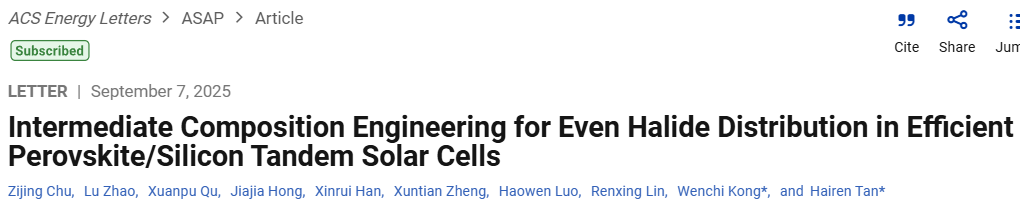 9月7日,南京大学谭海仁/孔文池在ACS EnergyLetters发布题目为《Intermediate Composition Engineering for Even Halide Distribution in EfficientPerovskite/Silicon Tandem Solar Cells》文章。