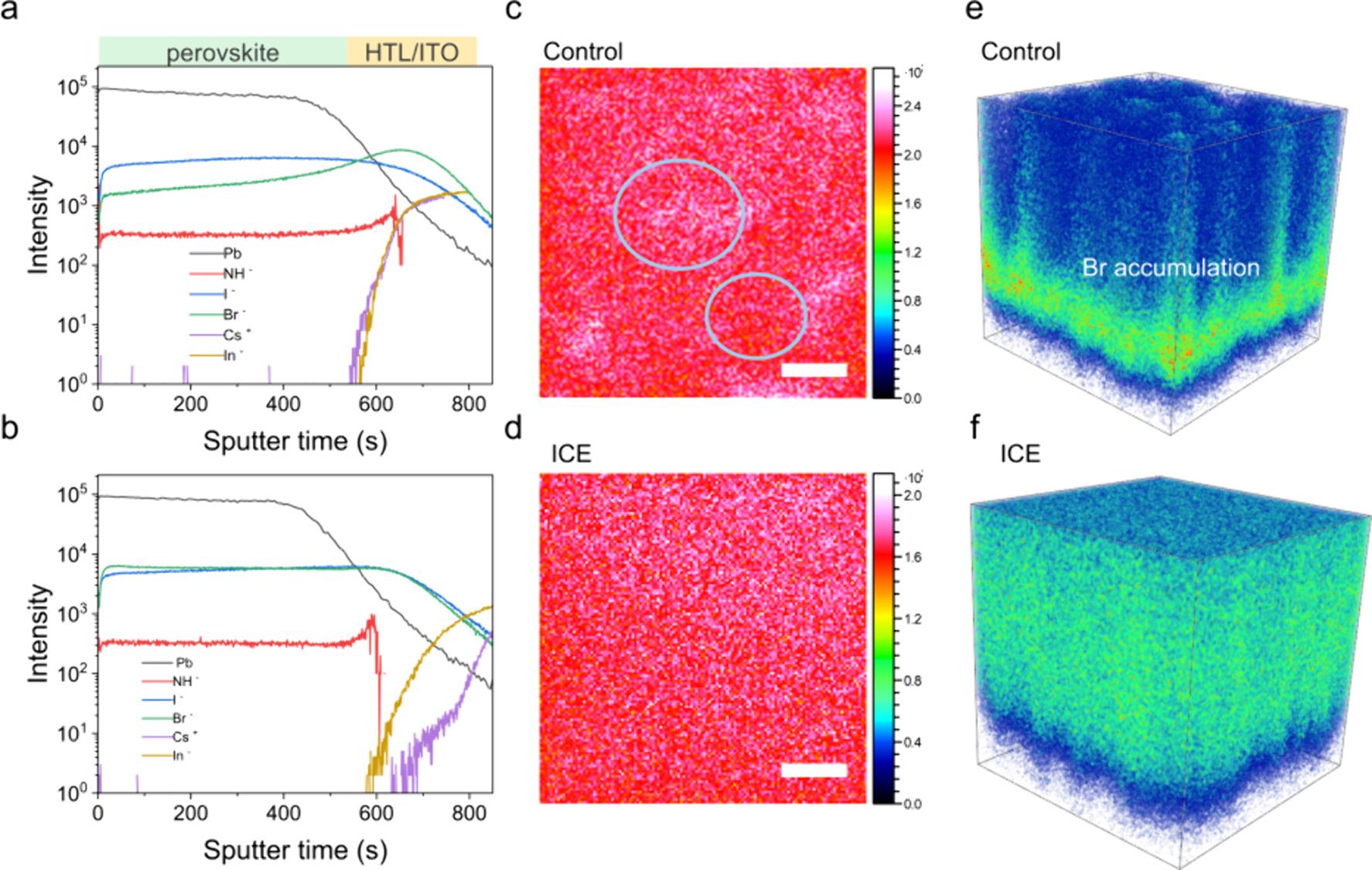 图 1. 钙钛矿薄膜中的卤化物分布。(a)对照钙钛矿薄膜和(b)ICE 薄膜的飞行时间二次离子质谱(TOF-SIMS)深度剖面。(c)对照薄膜和(d)ICE 薄膜中 Br⁻的 TOF-SIMS mappings,比例尺:10 μm。(e)对照薄膜和(f)ICE 薄膜中 Br 分布的重建 3D 图像。