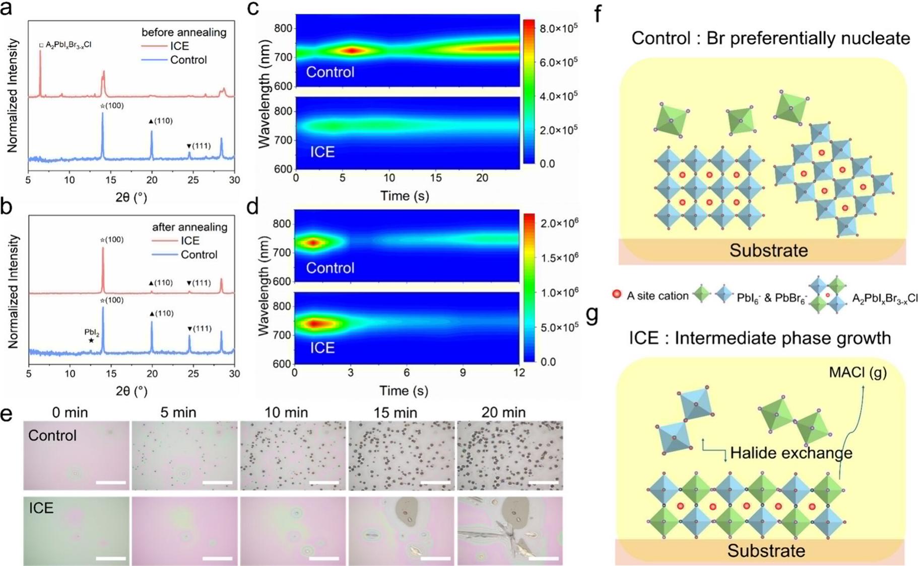 图 2. 结晶过程的原位表征及机理分析。对照组和 ICE 钙钛矿湿膜在(a)退火前和(b)退火后的 XRD 图谱。钙钛矿薄膜在(c)旋涂过程和(d)退火过程中的原位 PL 光谱。(e)对照组和 ICE 薄膜晶粒生长过程的原位光学显微镜图像,比例尺:50 μm。(f)对照组和(g)ICE 钙钛矿薄膜的结晶路径示意图。