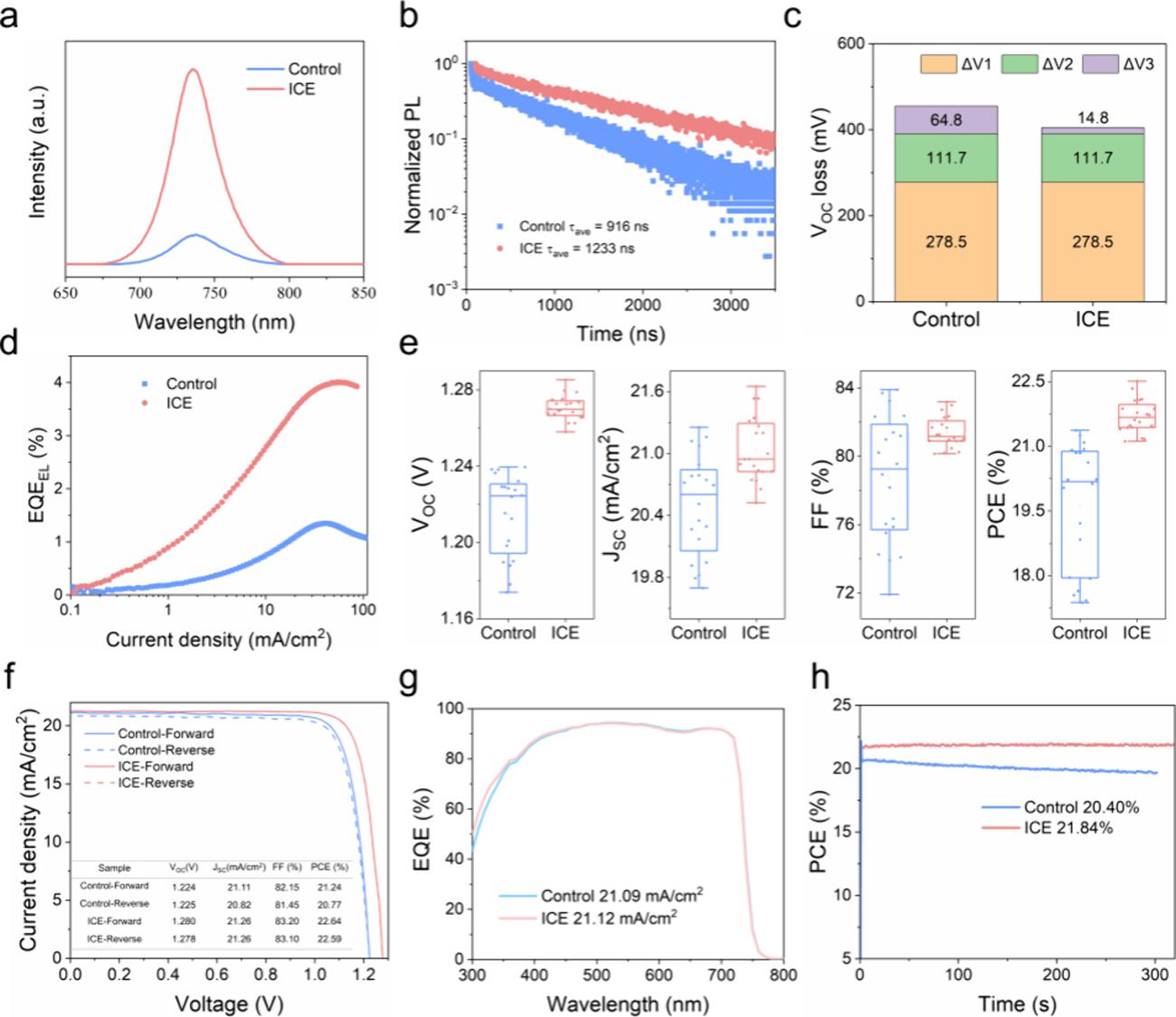 图 3. 钙钛矿薄膜的光电质量和 WBG 器件的光伏性能。(a) 不同钙钛矿薄膜的稳态光致发光(PL)光谱。(b) 不同钙钛矿薄膜的时间分辨光致发光(TRPL)光谱。(c) 对照器件和 ICE 器件的 VOC 损失分析,包括 Eg 以上的辐射复合(ΔV1)、黑体辐射损失(ΔV2)和非辐射复合损失(ΔV3)。(d) 钙钛矿器件的电致发光。(e) 单结钙钛矿太阳能电池(0.049 cm²)的统计光伏参数。(f) 最佳对照器件和 ICE 器件的 J-V 曲线。(g) WBG 对照器件和 ICE 器件的外量子效率(EQE)测量。(h) 对照器件和 ICE 器件的稳定功率输出。