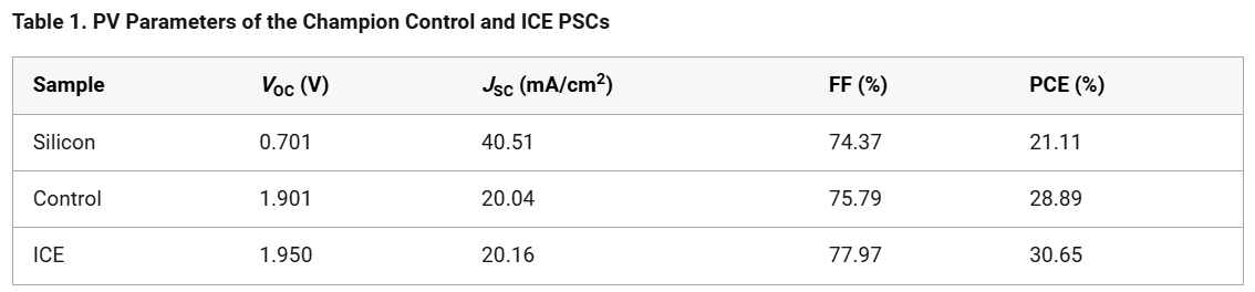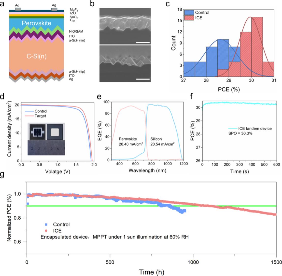 微米。(c)叠层器件光电转换效率(PCE)的分布统计。(d)最优对照组和 ICE 叠层太阳能电池的电流 - 电压(J-V)曲线。(e)ICE 叠层太阳能电池子电池的外量子效率(EQE)光谱及相应的积分短路电流密度(JSC)。(f)ICE 叠层太阳能电池的稳态功率输出(SPO)。(g)对照组和 ICE 钙钛矿 / 硅叠层器件在 1 个太阳连续光照(AM 1.5 G)下的最大功率点跟踪(MPPT)测量。