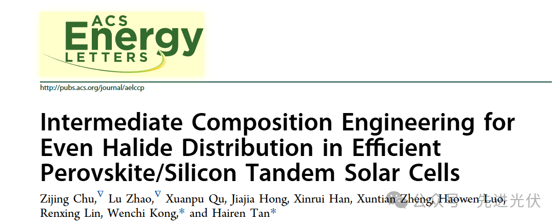 Chu, Z.; Zhao, L.; Qu, X.; Hong, J.; Han, X.; Zheng, X.; Luo, H.; Lin, R.; Kong, W.; Tan, H. Intermediate Composition Engineering for Even Halide Distribution in Efficient Perovskite/Silicon Tandem Solar Cells. ACS Energy Lett. 2025, *10*, 4787–4795.