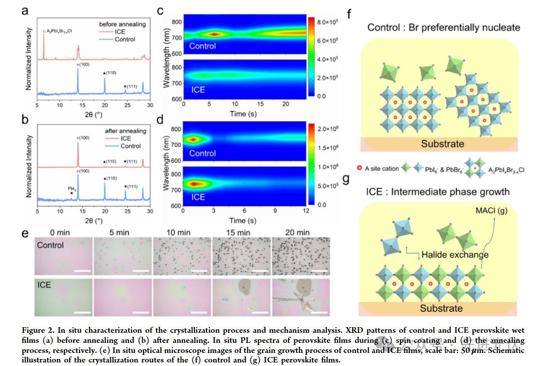 结晶动力学优化:原位PL与光学显微镜显示ICE薄膜成核速率减缓、晶粒生长速率提升,平均晶粒尺寸从250 nm增至420 nm。
