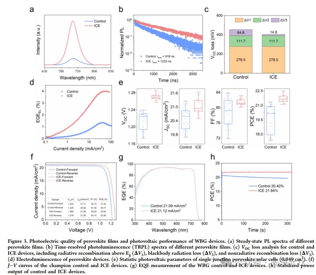 图3系统比较了薄膜光电性能与器件效率。稳态PL光谱显示ICE薄膜的荧光强度提高2.3倍,TRPL测得载流子寿命从916 ns延长至1233 ns,表明缺陷态密度显著降低。电致发光量子产率(ELQY)从1.34%提升至4%,证实非辐射复合损失减少。冠军器件效率从21.24%提升至22.64%,开路电压(Voc)增加56 mV达到1.280 V,达到Shockley-Queisser极限的93%。效率提升主要归因于△V3(非辐射复合损失)从64.8 mV降至14.8 mV,而辐射复合损失(△V1)和黑体辐射损失(△V2)基本保持不变。