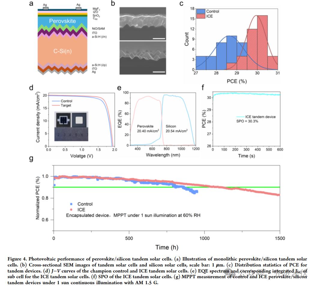 图4展示了钙钛矿/硅叠层太阳能电池的性能突破。器件结构采用双面织构化硅底电池,通过ICE策略优化的宽带隙钙钛矿顶电池(1.67 eV)与硅底电池(1.12 eV)形成理想带隙匹配。认证效率达到30.5%(1.21 cm²有效面积),创下当时文献报道的最高值之一。关键参数分析显示叠层电池的Voc达到1.950 V(硅子电池0.701 V+钙钛矿子电池1.280 V),填充因子(FF)提升至77.97%。最大功率点跟踪(MPPT)测试表明封装器件在环境大气中运行1087小时后仍保持90%初始效率,显著优于对照组的865小时衰减周期。