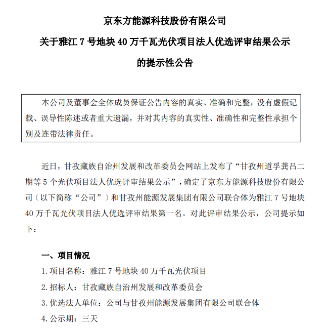 近日,京东方能源科技股份有限公司发布公告称,甘孜藏族自治州发展和改革委员会网站上发布了“甘孜州道孚龚吕二期等 5 个光伏项目法人优选评审结果公示”,确定了京东方能源科技股份有限公司和甘孜州能源发展集团有限公司联合体为雅江7 号地块40 万千瓦光伏项目法人优选评审结果第一名。